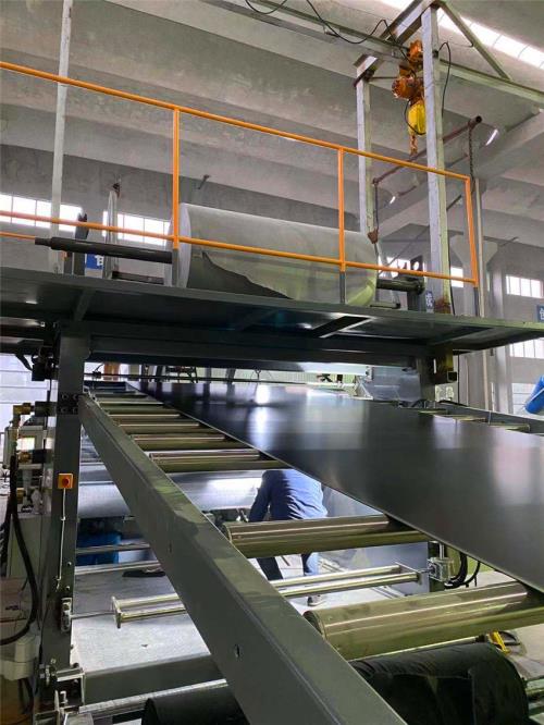 每個輥筒軸端均配有一傳動減速箱,傳動 平穩(wěn)、噪音低、效率高,結構緊湊。電動機采用伺服電機,功率:2.2 kw×3臺;三輥線速度為0-10米分鐘3、輥筒組件1) 輥筒直徑:上輥φ400mm /中輥φ400mm/下輥φ400mm,輥面寬度1300mm2) 輥筒,輥筒控溫水進出口徑:11/4”輥筒圓度:0.005mm,輥筒同軸度:φ0.012mm輥筒表面粗糙度:Ra0.025μm,輥筒外圓表面淬硬HRC55~60,淬硬深度3~5mm;輥筒表面鍍硬鉻,t=0.08~0.10,輥筒壁厚:30mm4、輥筒調(diào)距裝置1) 輥筒上下采用電動渦輪蝸桿升降。微調(diào)為手動,并兩端可單獨調(diào)節(jié),調(diào)節(jié)范圍0-70mm,2) 輥筒間隙調(diào)整采用絲桿結構,手動微調(diào),微調(diào)范圍:1-5mm,刻PE防水卷材生產(chǎn)線度盤指示5、移動組件1) 整個移動組件由傳動系統(tǒng)、滾輪升降組件等組成,傳動電機功率:0.37kw采用雙級減速器傳動,移動平穩(wěn),亦可手動微調(diào)2)三輥前后移動導軌要求長度為:1500mm;導軌上要有預留固定孔;方便在客戶現(xiàn)場安裝膨脹螺絲(六)輥筒控溫裝置(一組/套)模溫機1) 輥筒的控溫由水溫控制箱來完成,最高控制油溫90℃2)水泵泵電機功率:0.75kw;自動控水電磁閥;手動閥用銅閘閥控制;加大水流量, 3)采用環(huán)保風冷卻系統(tǒng)(環(huán)保型:發(fā)明專利號:CN201911312134.6)不需要接外循環(huán) 水冷卻,不用徘外水;采用閉環(huán)循環(huán)系統(tǒng)(七)冷卻牽引切邊裝置1) 牽引電機功率:0.55kw,壓輥為橡膠輥,主動輥為橡膠輥牽引,牽引輥直徑:φ150mm,牽引被動輥有效提升距離為:50mm2) 托架總長12米.,平托架,方管結構。過渡冷卻輥材質:φ63不銹鋼,輥面寬度1100mm3) 兩側兩把切刀可有效切除廢料,使片材達到所需要的寬度,備用4把刀;刀架能上下收縮;安裝刀片的刀桿上帶鍵槽;方便統(tǒng)一調(diào)整刀的角度(八)雙工位收卷PE防水卷材生產(chǎn)線機(二個輥筒)1)鋁制收卷氣漲軸 :71*1200mm,最大收卷直徑 Φ500mm,最高線速度:V=10米/分。2)飛刀切斷系統(tǒng)一套,放卷平臺一件塑料造粒機:http://www.bsjdl.com/