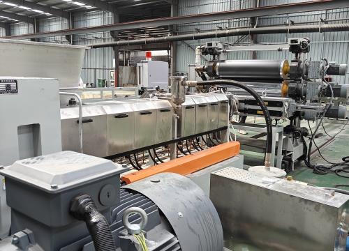 2. 熔融擠出:混合好的原料送入擠出機(jī),在加熱和螺桿剪切作用下熔融塑化,通過扁平模具擠出成型。